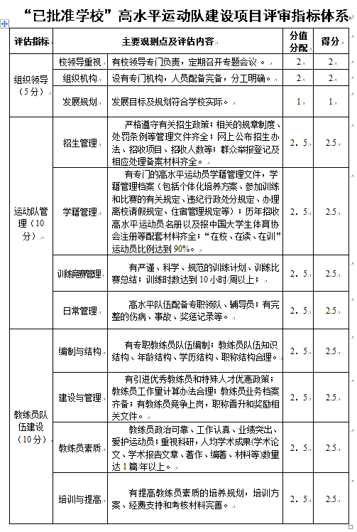 2.運動隊管理(lǐ)(一(yī)級指标總10分(fēn),自評10分(fēn))