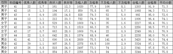 近三年實施《國家學生(shēng)體(t志長ǐ)質健康标準》狀況(按年度測試數據填寫,理村限200字) | 近3年測試率分(fēn)别為(wèi):98%、98%、97%,及格率分(fēn)别為(wèi)87%、88%、87%。統計顯示,我校(xiào)近3年學生(shēng)體(tǐ)質測試優秀率12%,良好(hǎo)(hǎo)率39%,及格率46%,總及格率87%,不及格率13%。通過開展陽光體(tǐ)育運動,實施《國家學生呢房(shēng)體(tǐ)質健康标準》,學生(shēn又歌g)體(tǐ)質健康水平整體(tǐ)向好(hǎo)(hǎo)發展。目前看間,學生(shēng)體(tǐ)質測試經費專的年項已列入學校(xiào)年度預算(suàn上習)、專門網站(zhàn)已建設完成。 | ||||||