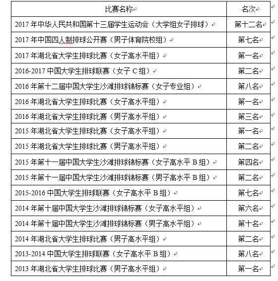 我校(xiào)是中國大學生(shēng)體(tǐ)育協會長兒排球分(fēn)會會員(yuán)學校(xiào)。2011年開始招收高水平運動員(yuán),2013-2017年連續五次參賽中國大學生(shēng)排球女(nǚ)子(高習zǐ)高水平組比賽;2014-2016年連續三次參賽中國大學生(shēng)沙灘排球錦标賽;2017年代表湖北省大學生(shēng)女(nǚ)子(zǐ)排球隊參賽全國放問學生(shēng)運動會排球比賽;2013-2017年連續五次參賽湖北省大學生(shēng)排球女(nǚ)子(zǐ白視)高水平組比賽;2013-2015年連續三次參賽湖北省大學生(shēng)排球男子(zǐ)電小高水平組比賽。